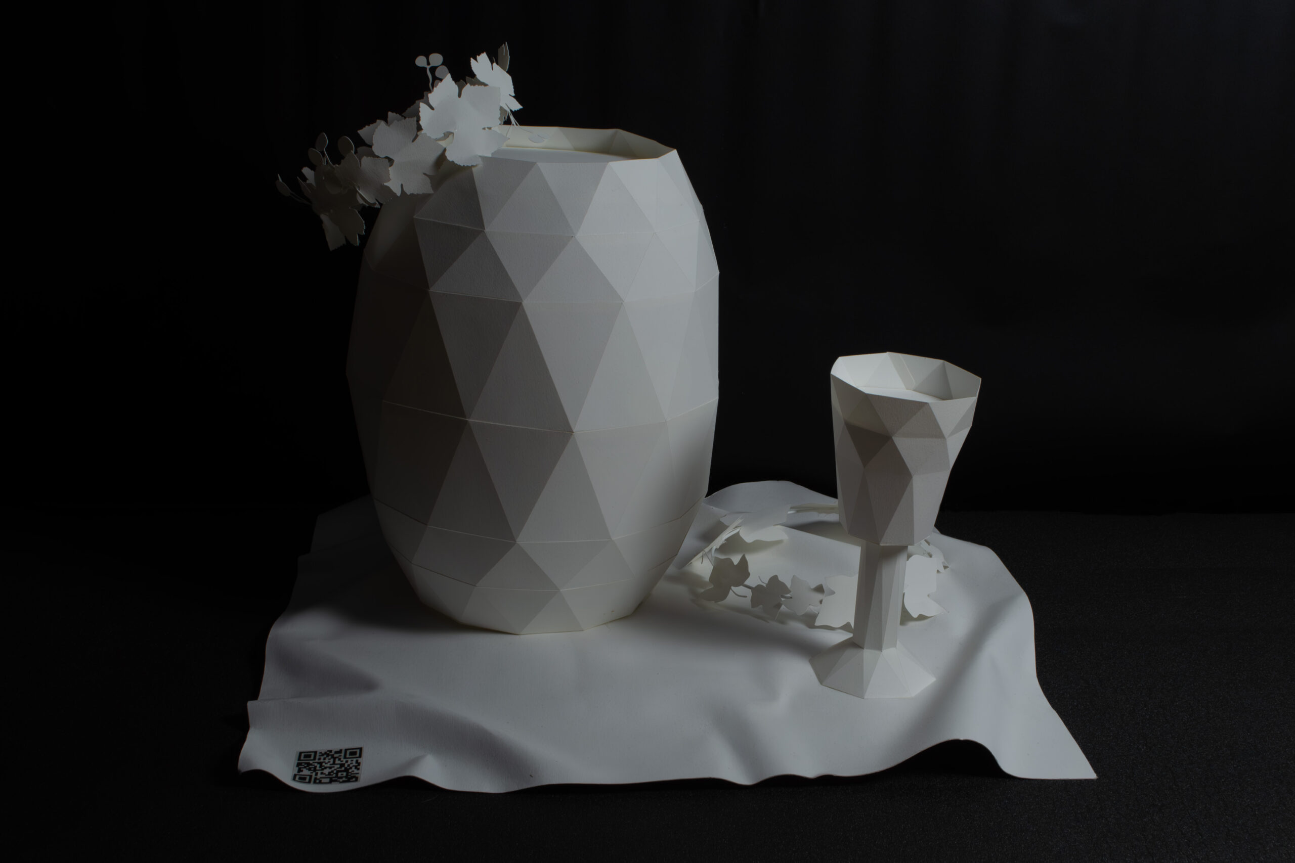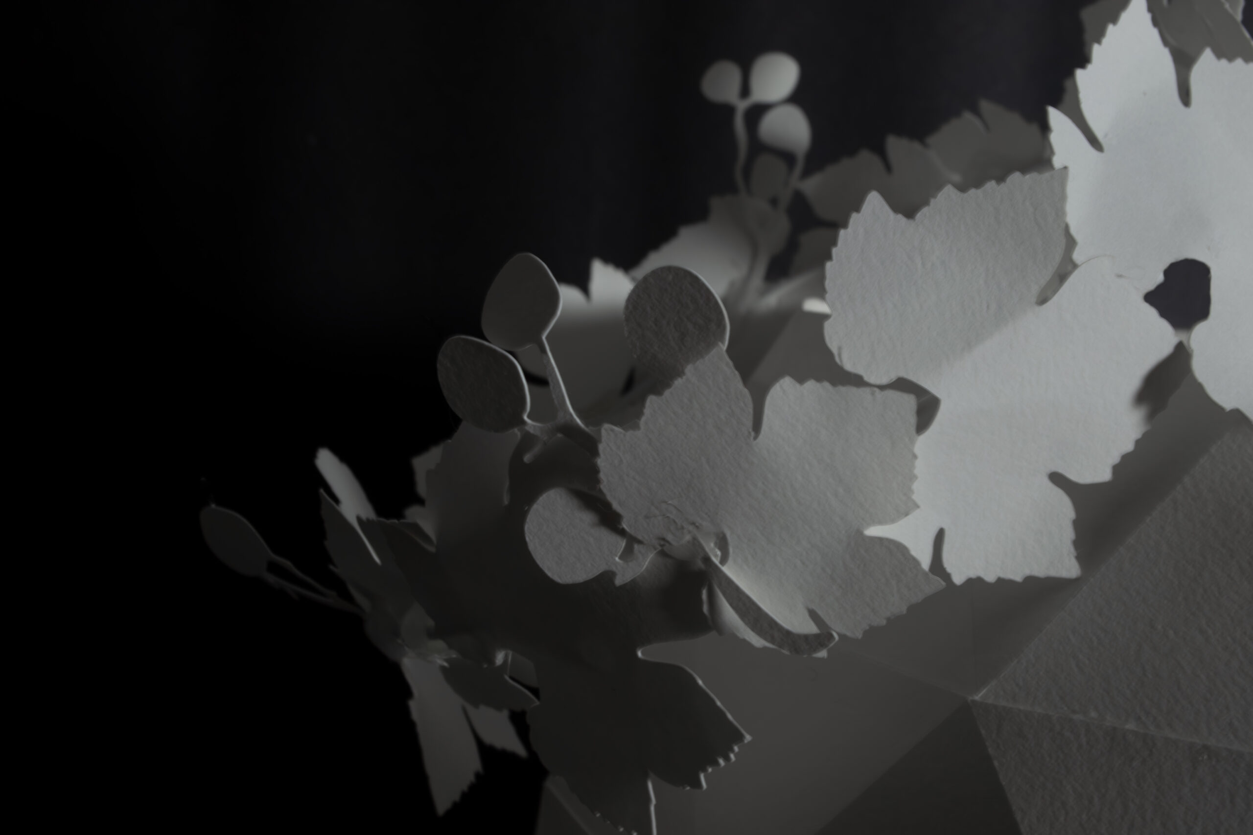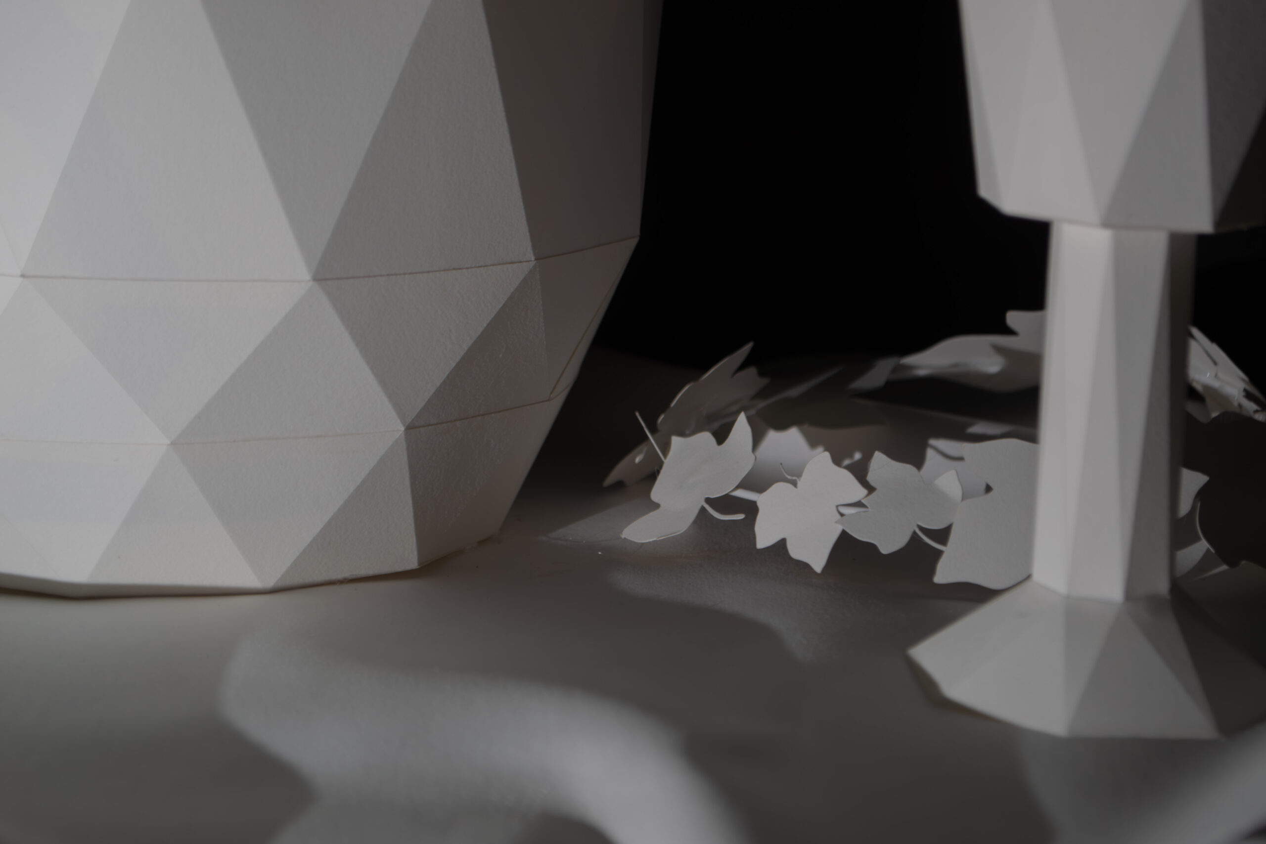 La pieza, hecha íntegramente en papel, tiene dos vistas: una apagada, limpia y minimalista, y otra encendida, donde la escena se revela iluminada desde dentro. Nosotras mismas diseñamos el modelo 3D, el montaje, el circuito de luces y las fotografías.